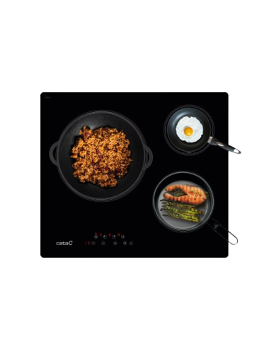 Equipada con tres zonas de cocción, la Cata TT6003 destaca especialmente por su fuego Triple Corona, ideal para recipientes grandes y para cocinar a máxima potencia en menor tiempo.